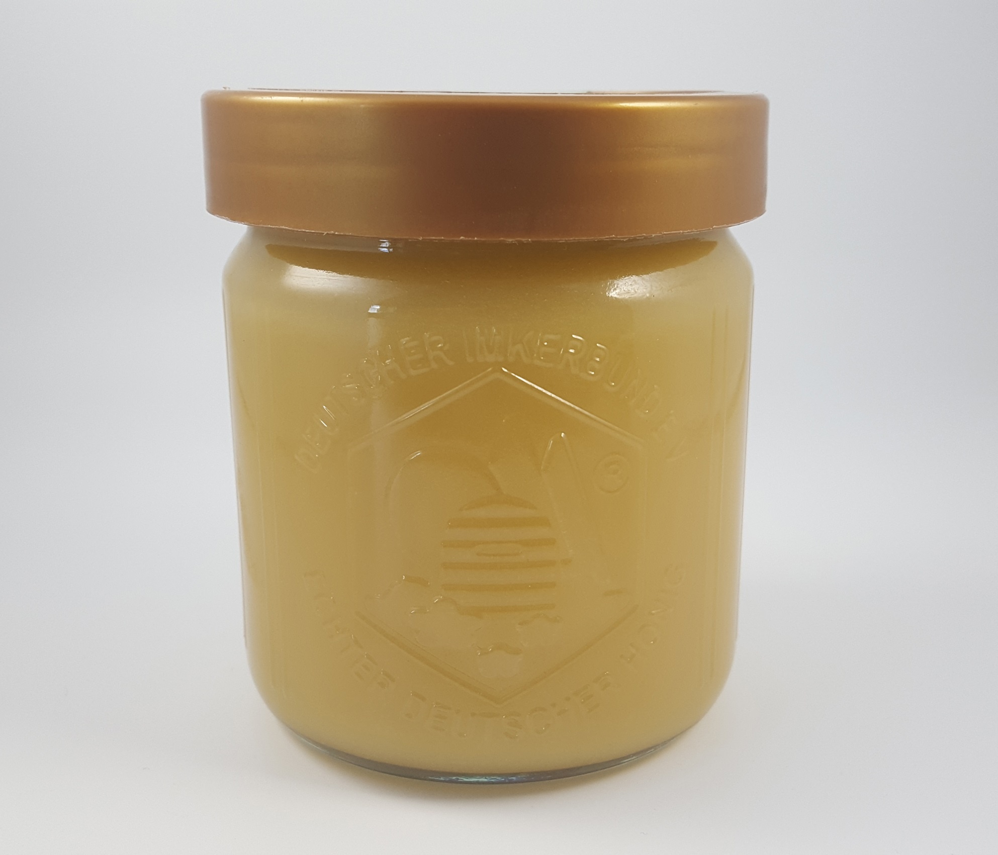 Mild würzig im Geschmack, ganze Wabe ausgepresst und nur grob gesiebt dadurch mehr Propolis, Wachs und Pollen.