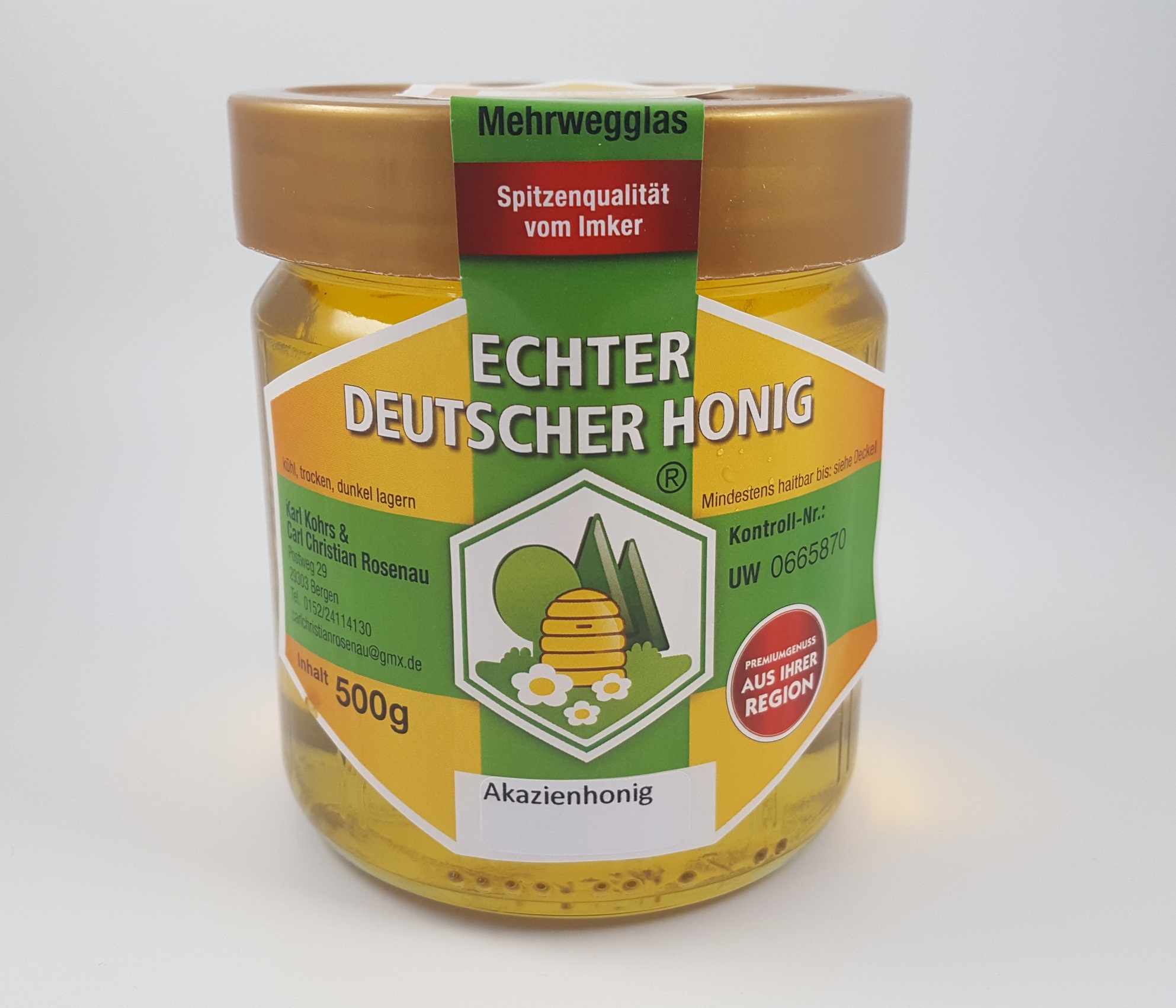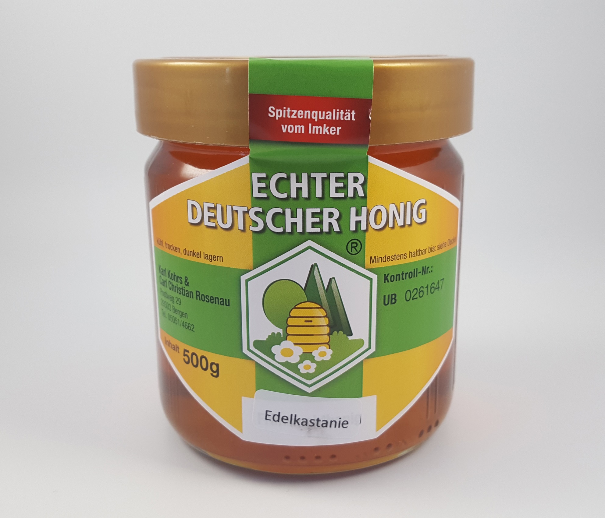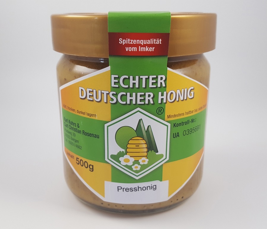 Mild würzig im Geschmack, ganze Wabe ausgepresst und nur grob gesiebt dadurch mehr Propolis, Wachs und Pollen.